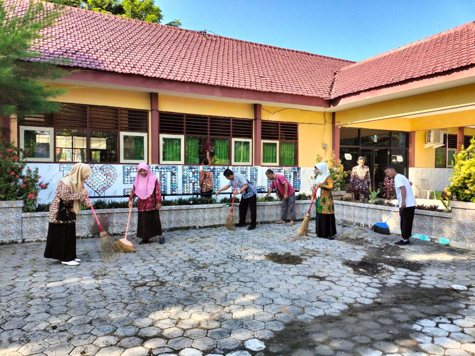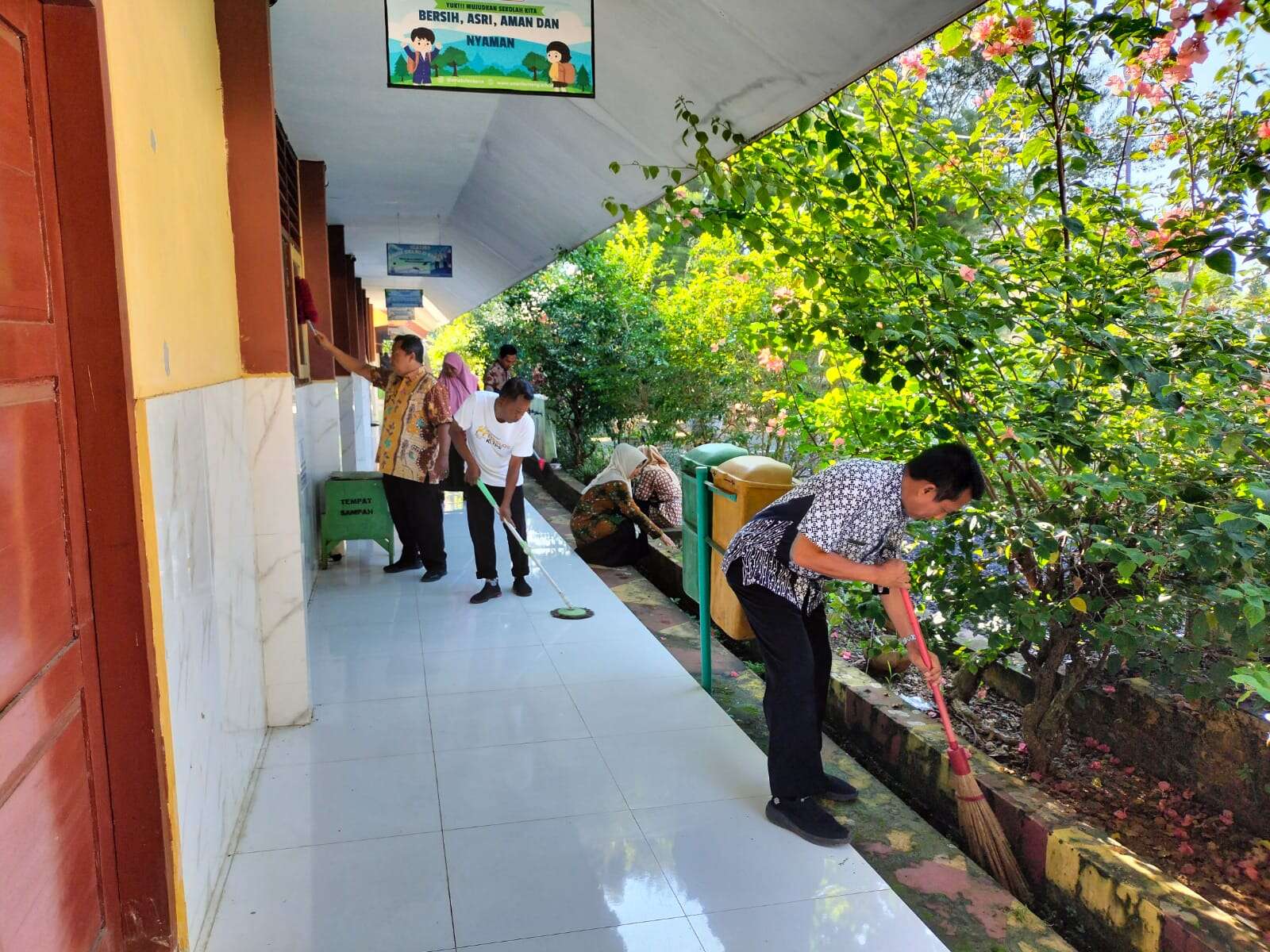 Kegiatan bersih-bersih lingkungan sekolah oleh guru dan tenaga kependidikan, diawali dari ruang guru, ruang tamu, kamar mandi, halaman sekolah, taman sekolah dan sekitarnya (mam/admin)